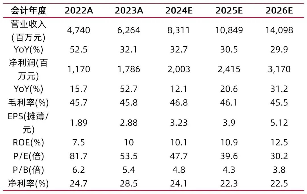 预计公司2024-2026年归母净利润分别为20.0\24.2\31.7亿元,同比分别增长12.1%/20.6%/31.2%,对应EPS分别为3.23\3.90\5.12元,对应3月20日收盘价154.38元,PE分别为47.7\39.6\30.2倍。维持“买入-A”的投资评级。