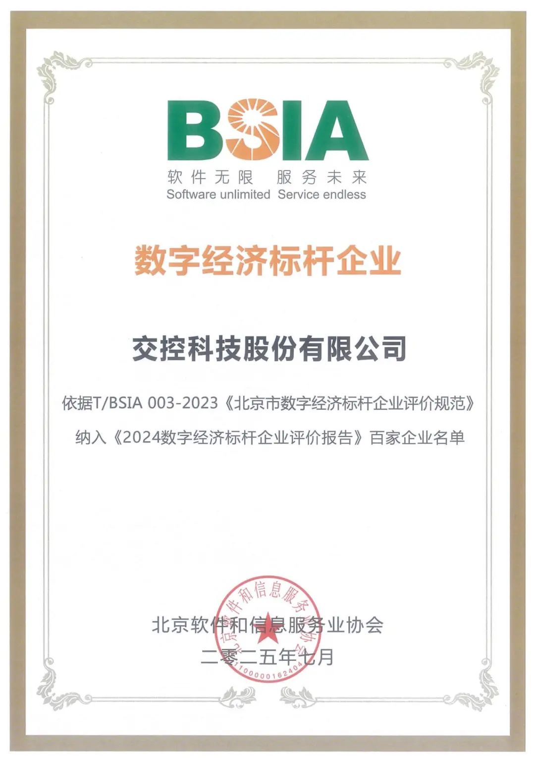 此次评选由北京软件和信息服务业协会、北京市数字经济促进中心、中国信息通信研究院、德勤中国等权威机构组成评价工作组,遵循“政策引领、标准先行、动态评估”的闭环机制,依据《北京市数字经济标杆企业评价规范》团体标准,经层层筛选、严格审查,从众多优秀企业中脱颖而出100家标杆企业,交控科技荣耀登榜,这份沉甸甸的荣誉背后,是行业与市场对公司多年来深耕数字经济以赋能轨道交通转型升级的高度认可。