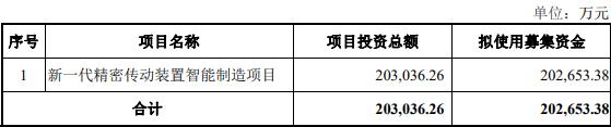 本次向特定对象发行股票募集资金总额不超过人民币20.27亿元(含本数),扣除相关发行费用后的募集资金净额拟全部用于新一代精密传动装置智能制造项目。