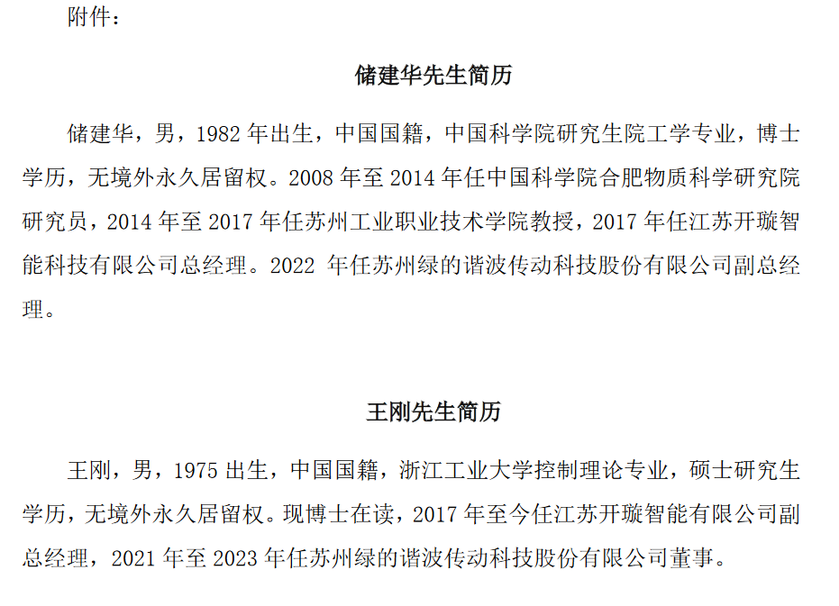绿的谐波(688017)于9月21日发布公告称,苏州绿的谐波传动科技股份有限公司(以下简称“公司”)原董事王刚先生因公司内部调整原因已于近日向公司董事会递交了辞职报告,王刚先生请辞公司第二届董事会董事职务。根据《中华人民共和国公司法》《苏州绿的谐波传动科技股份有限公司章程》(以下简称“《公司章程》”)的规定,王刚先生的辞职未导致公司董事会成员低于法定最低人数,不会对公司董事会运作产生重大影响,其辞职报告自送达公司董事会时生效。