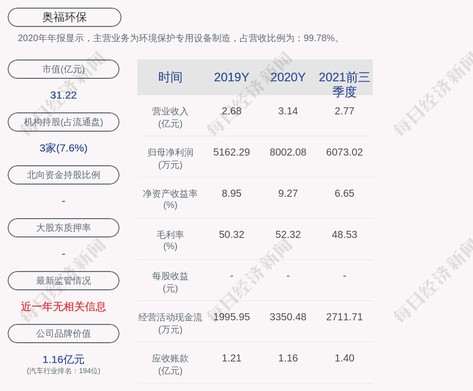2020年年报显示,奥福环保的主营业务为环境保护专用设备制造,占营收比例为:99.78%。