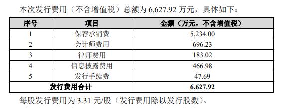 奥福环保发行费用(不含增值税)总额为6,627.92万元,其中,安信证券获得保荐承销费5,234.00万元。