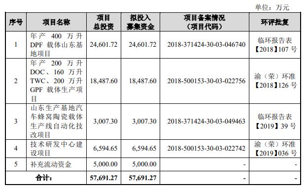 奥福环保最终募集资金净额比原计划少11979.19万元。2019年10月31日,奥福环保发布的首次公开发行股票并在科创板上市招股说明书显示,公司拟募集资金57,691.27万元,分别用于年产400万升DPF载体山东基地项目,年产200万升DOC、160万升TWC、200万升GPF载体生产项目,山东生产基地汽车蜂窝陶瓷载体生产线自动化技改项目,技术研发中心建设项目,补充流动资金。