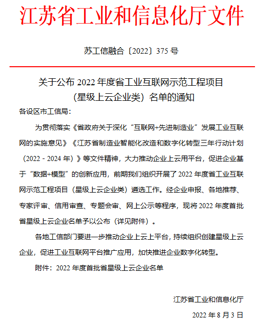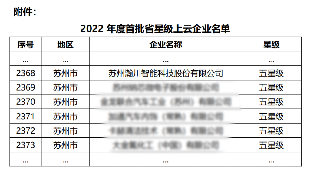 近期,江苏省工业和信息化厅公布了“关于2022年度省工业互联网示范工程项目和两化融合管理体系贯标试点企业培育对象拟认定名单的公示”,苏州市瀚川智能科技股份有限公司成功入选2022年度首批星级上云企业名单,荣获“江苏省五星级上云企业”荣誉。