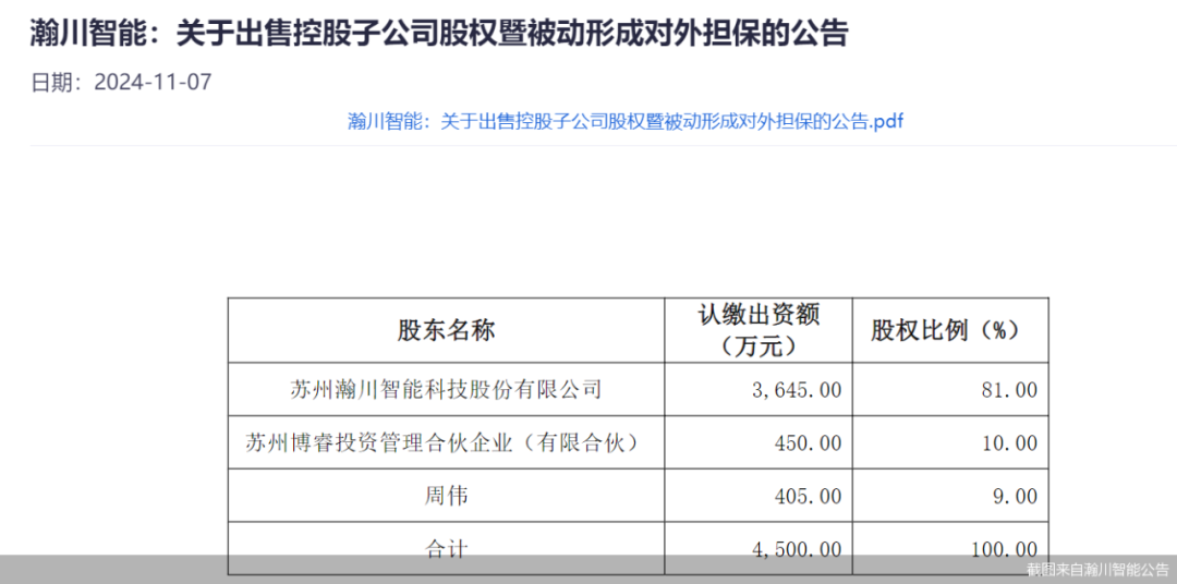 业绩承压的背景下,瀚川智能(688022)拟出售资产谋救。11月6日晚间,瀚川智能披露公告称,为进一步整合公司资源,聚焦主业发展、降低经营风险,公司拟将持有的控股子公司苏州博睿汽车电器有限公司(以下简称“博睿汽车”)全部81%股权转让,转让总价款为4840.65万元。值得一提的是,瀚川智能持有的博睿汽车81%的股权中,其中有26%的股权系三个月前刚刚收购而来。