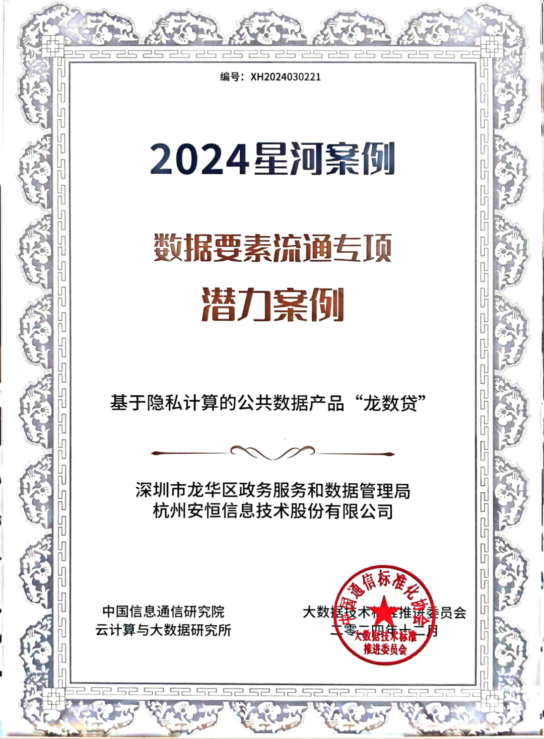 会上,第八届大数据“星河(Galaxy)”案例入围证书颁发,由深圳市龙华区政务服务和数据管理局和安恒信息联合申报的“基于隐私计算的公共数据产品‘龙数贷’”入选数据要素流通专项-潜力案例。