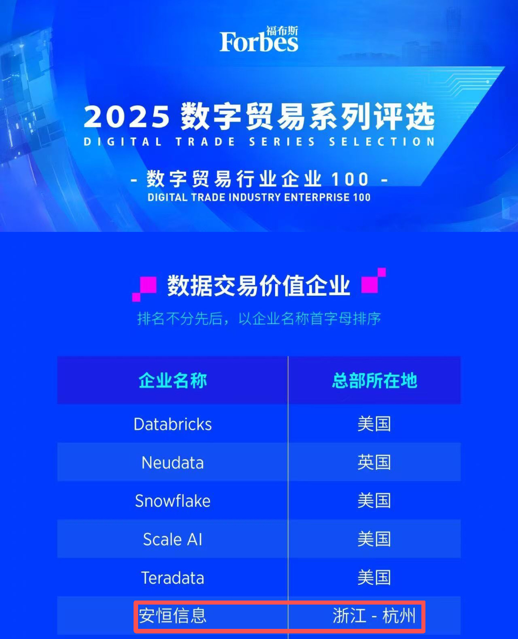 在当晚举行的“数贸之夜”活动现场,福布斯和赛迪顾问股份有限公司分别发布“2025全球数字贸易行业企业100评选”和“2025全国数字贸易企业百强榜”,安恒信息凭借在数据安全流通、AI驱动威胁防御、跨境合规等方面的综合能力,成为少数同时登榜的网络安全企业,体现了权威机构对其“以AI+安全赋能贸易”实践的高度认可。