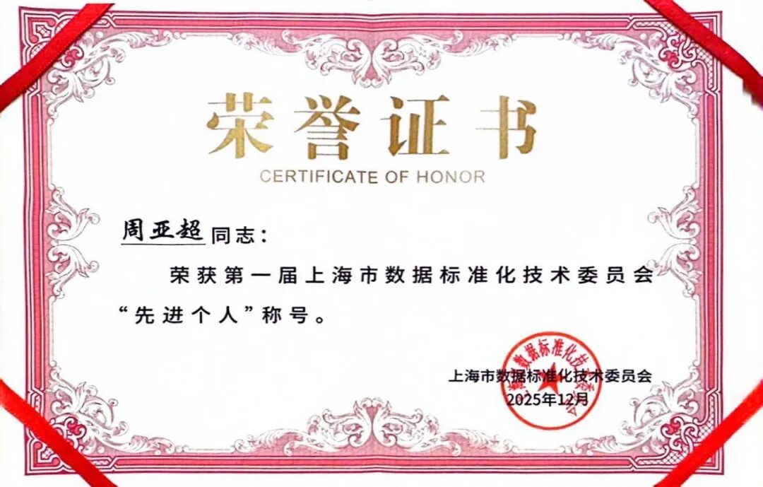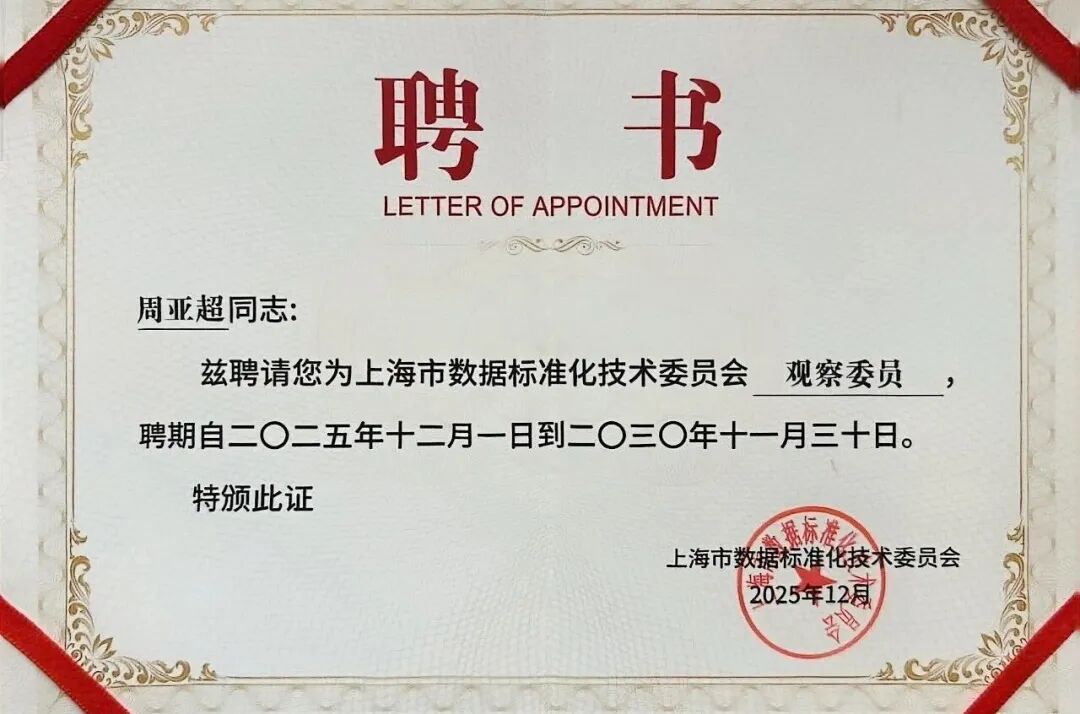 安恒信息副总裁、首席标准研究员周亚超荣获第一届上海市数据标准化技术委员会“先进个人”称号,并被聘为上海市数据标准化技术委员会观察委员。