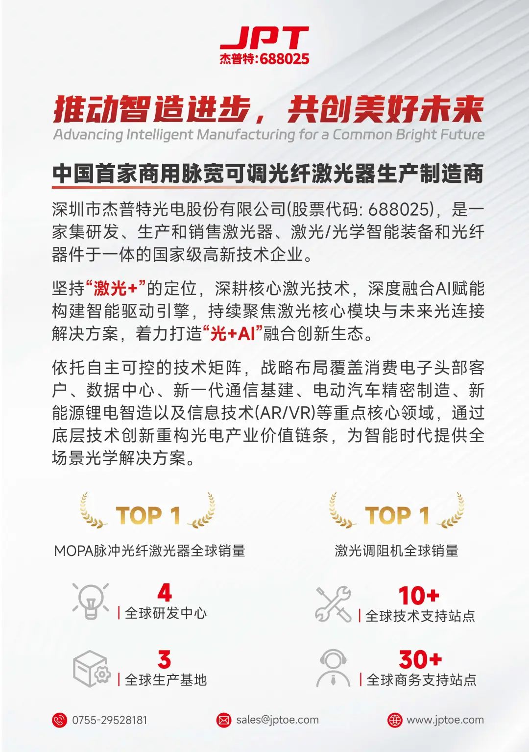 深圳市杰普特光电股份有限公司(股票代码:688025)是国家级高新技术企业,并已成为全球MOPA脉冲光纤激光器销量领先者。公司始终致力于激光核心技术的自主研发与突破,并通过“激光+AI”的深度融合,为消费电子、新能源、半导体、医疗器械及科研等领域提供创新的全场景光学解决方案。