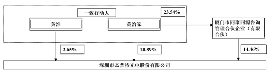 杰普特2024年年报显示,黄治家为杰普特的控股股东、实际控制人,黄治家与黄淮是父子关系。同聚同源为公司持股平台,黄治家为同聚同源的执行事务合伙人。