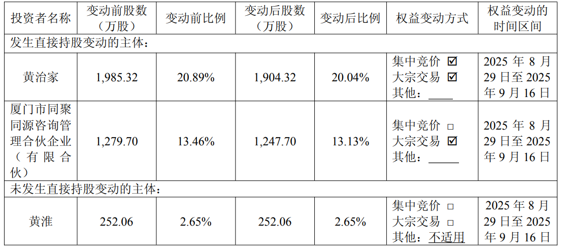 杰普特9月17日收到控股股东黄治家及其一致行动人厦门市同聚同源咨询管理合伙企业(有限合伙)(以下简称“同聚同源”)出具的《权益变动告知函》,获悉于2025年9月12日至2025年9月16日,黄治家与同聚同源通过大宗交易及集中竞价交易方式累计减持所持有的公司股份113.00万股,其中黄治家、同聚同源分别减持81.00万股、32.00万股,累计减持数量占公司当前总股本的比例为1.19%。