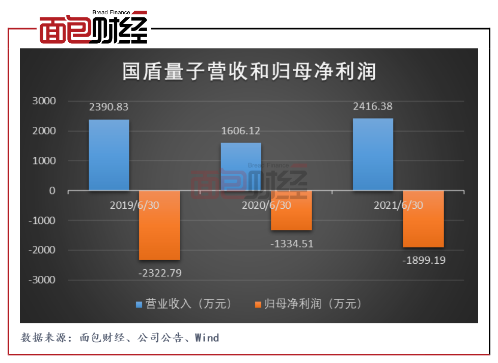 国盾量子近期发布2021年中报,数据显示,公司报告期间产生营业收入2416.38万元,较去年同期增加50.45%;当期归母净利润为-1899.19亿元,亏损较去年同期扩大42.31%。