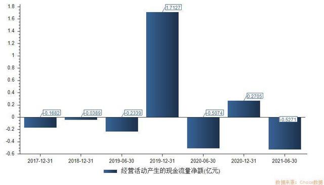 东财choice数据显示,2017-2021年上半年,国盾量子的现金流呈现不健康状态,仅有2019-2020两年年末是正数,分别为1.71亿元和0.27亿元。而2021年上半年公司现金流再次变脸,降至-0.53亿元。