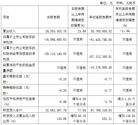 2022年第三季度,国盾量子研发投入合计为3208.34万元,同比增长77.84%;研发投入占营业收入的比例130.66%,较上年同期增加39.78个百分点。