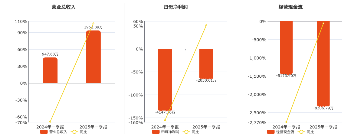 公司营业总收入为1952.39万元,较去年同报告期营业总收入增加1004.76万元,同比较去年同期上涨106.03%。归母净利润为-2030.61万元,较去年同报告期归母净利润增加2116.75万元。经营活动现金净流入为-8306.79万元。