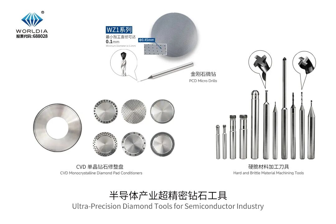 半导体:面向半导体先进制造领域,金刚石微钻、CVD单晶金刚石修整盘及各类硬脆材料加工刀具,作为超精密加工关键工艺工具,广泛应用于高硬脆材料的微纳结构加工与超精密成形工艺。在微孔加工、表面修整及尺寸精度控制等核心工序中发挥重要作用,助力提升器件加工精度、表面完整性及加工一致性,支撑高要求精密制造工艺的稳定实现。
