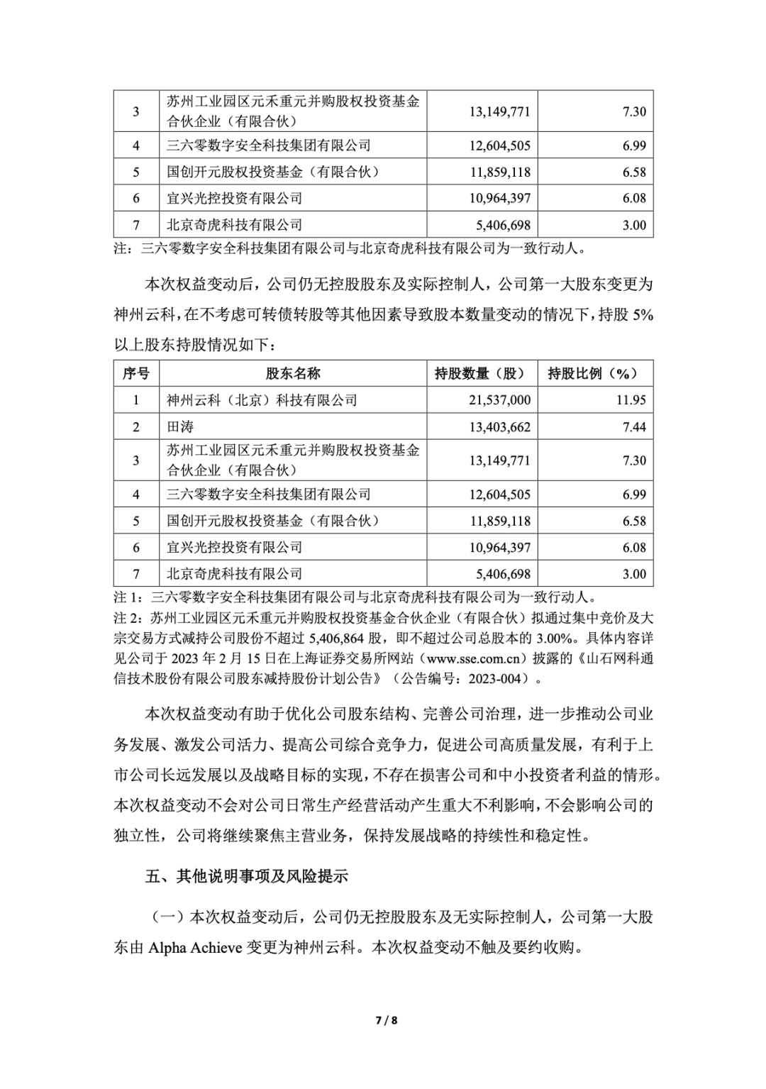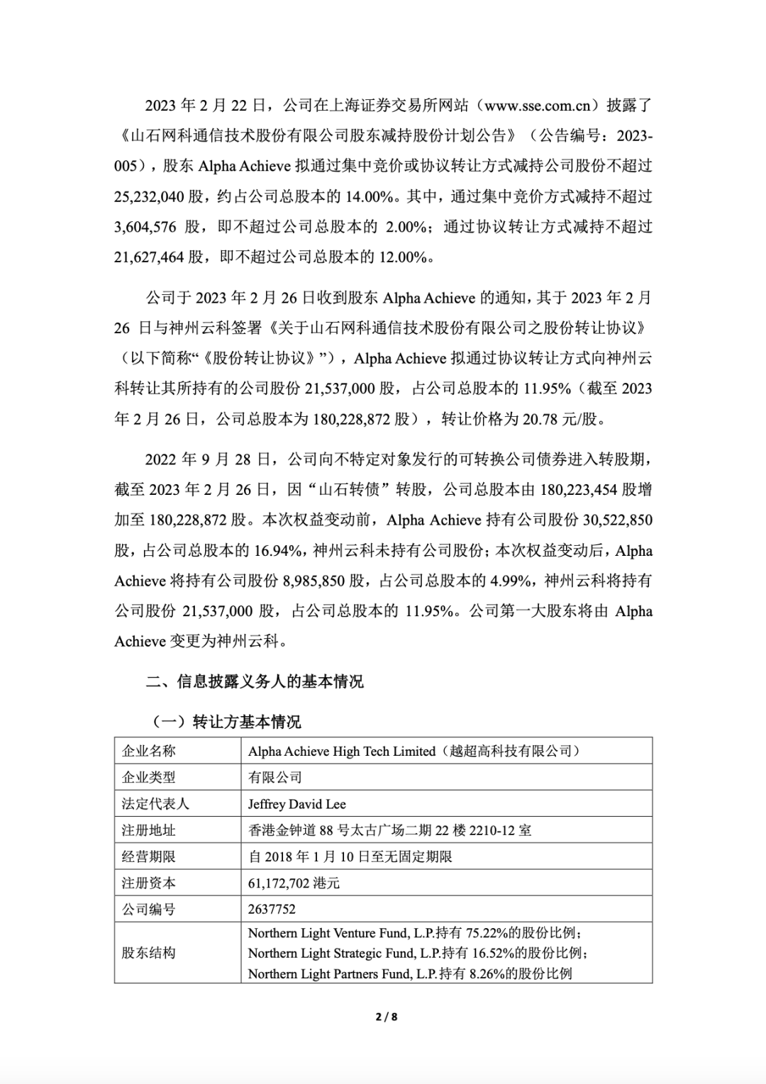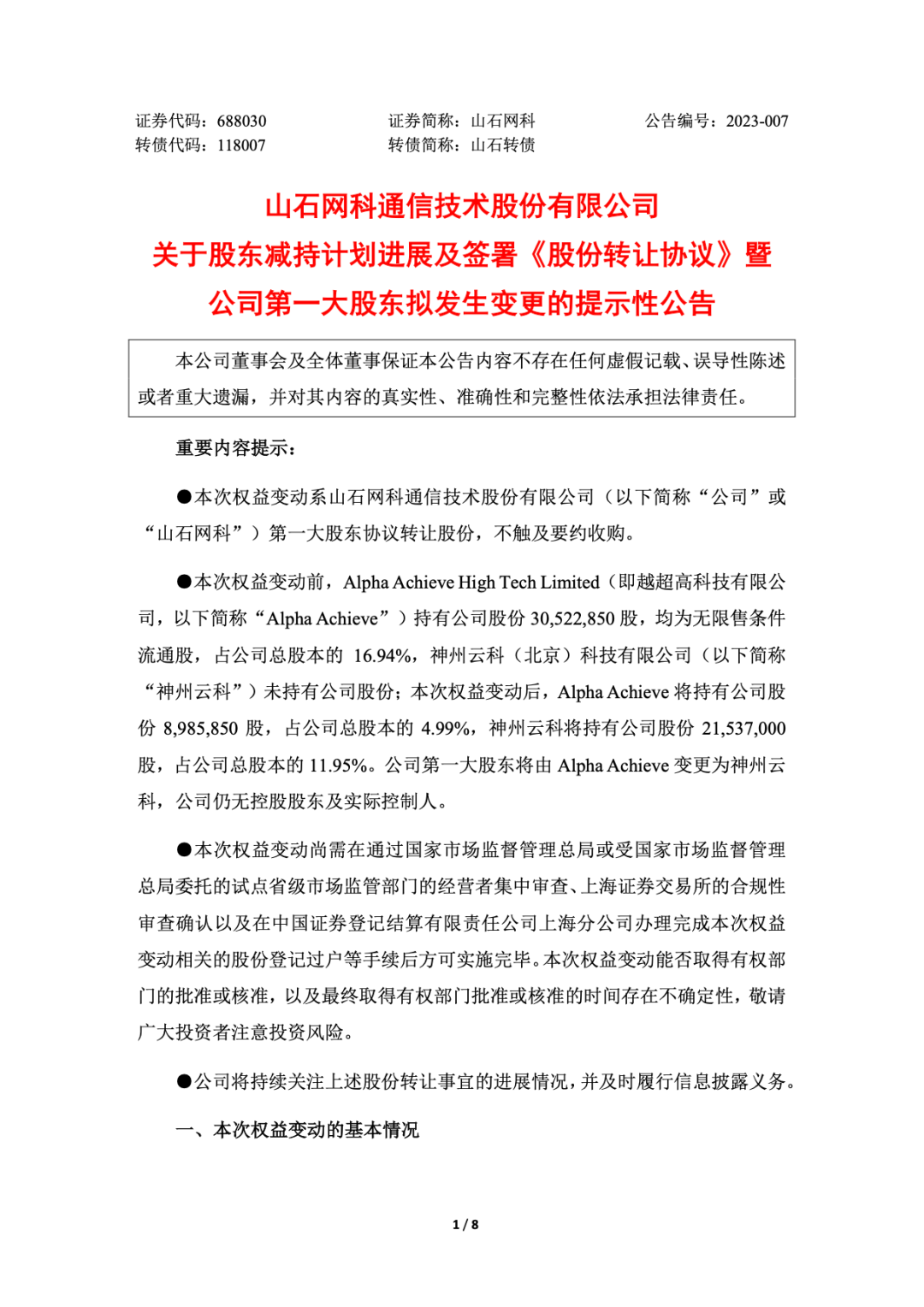 2023 年 2 月 26 日,Alpha Achieve High Tech Limited(越超高科技有限公司)与神州云科签订了《股份转让协议》,拟通过协议转让的方式向神州云科转让其持有的 21,537,000 股山石网科人民币普通股股份,占截至《股份转让协议》签署日山石网科总股本的 11.95%。