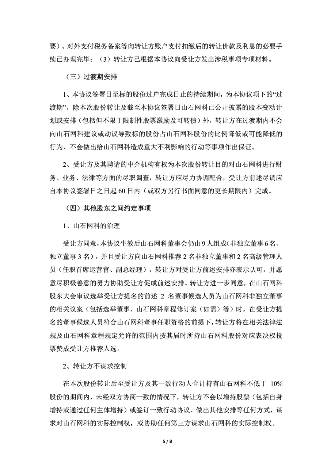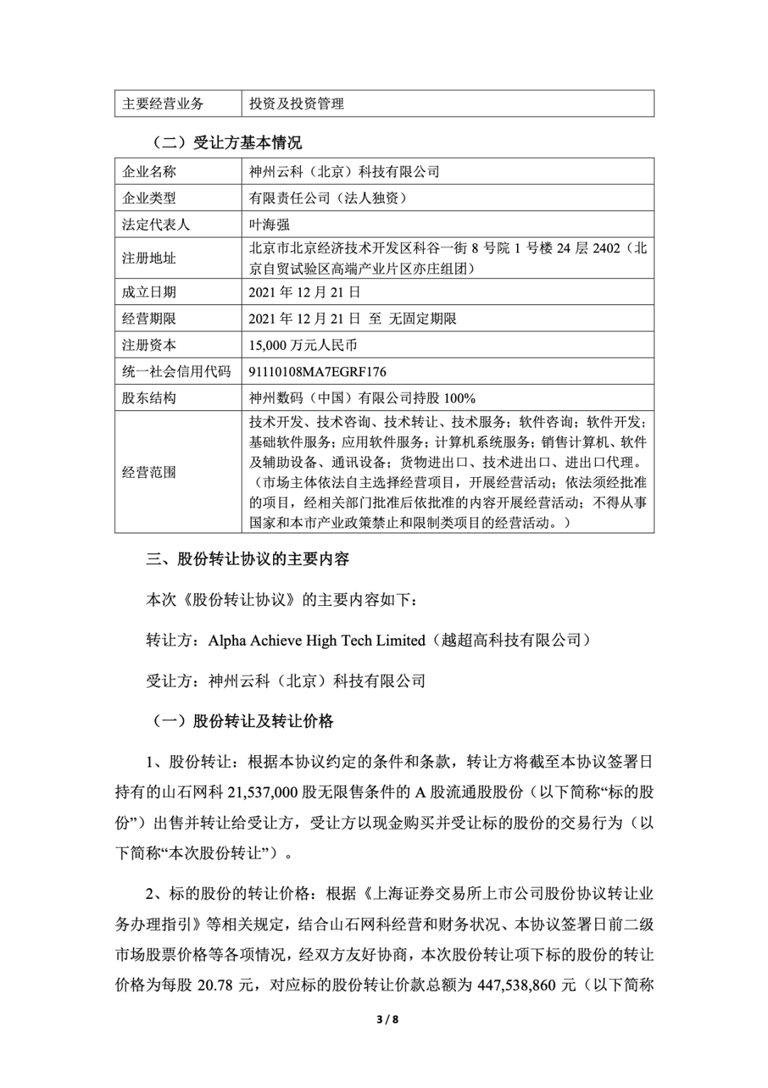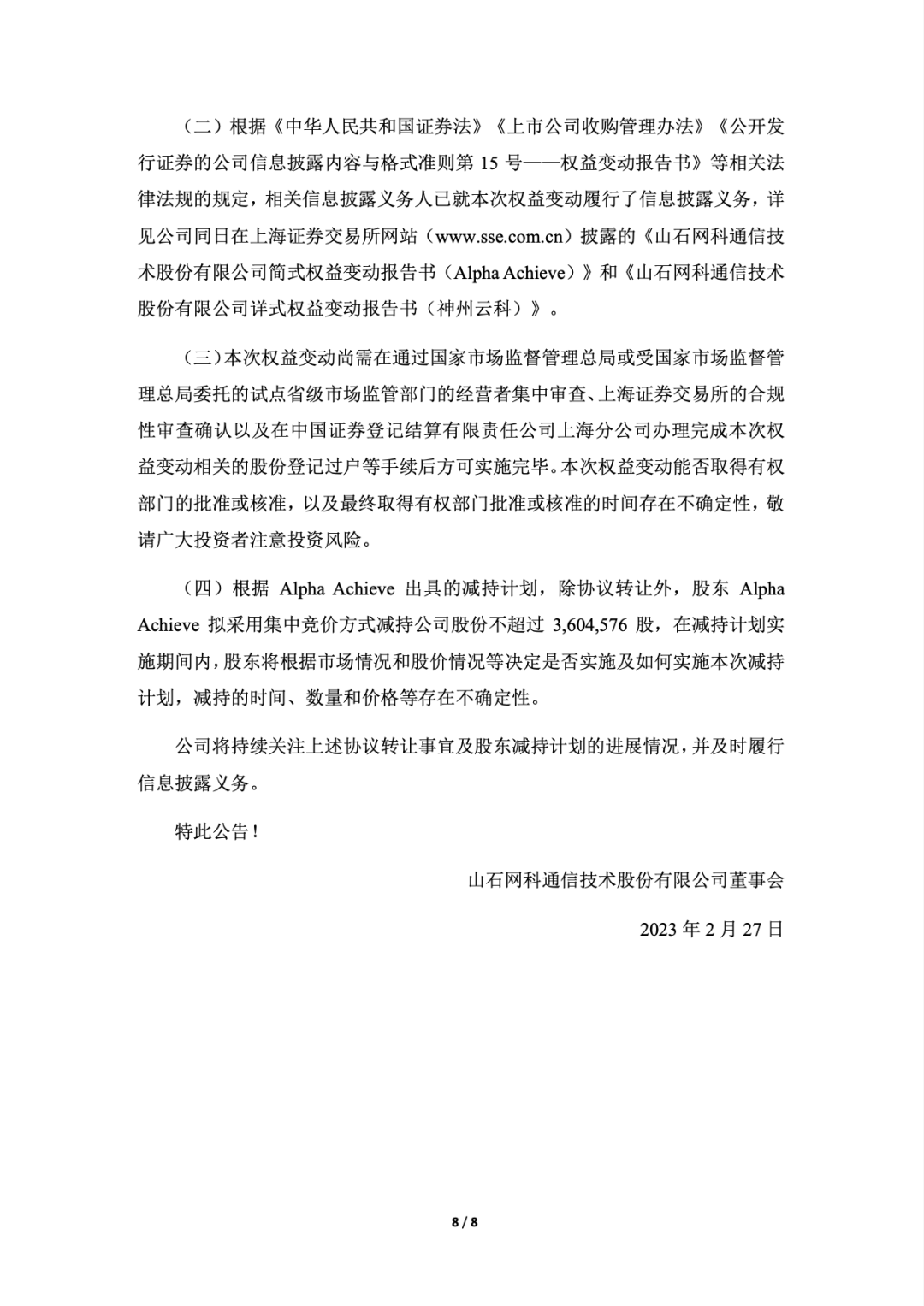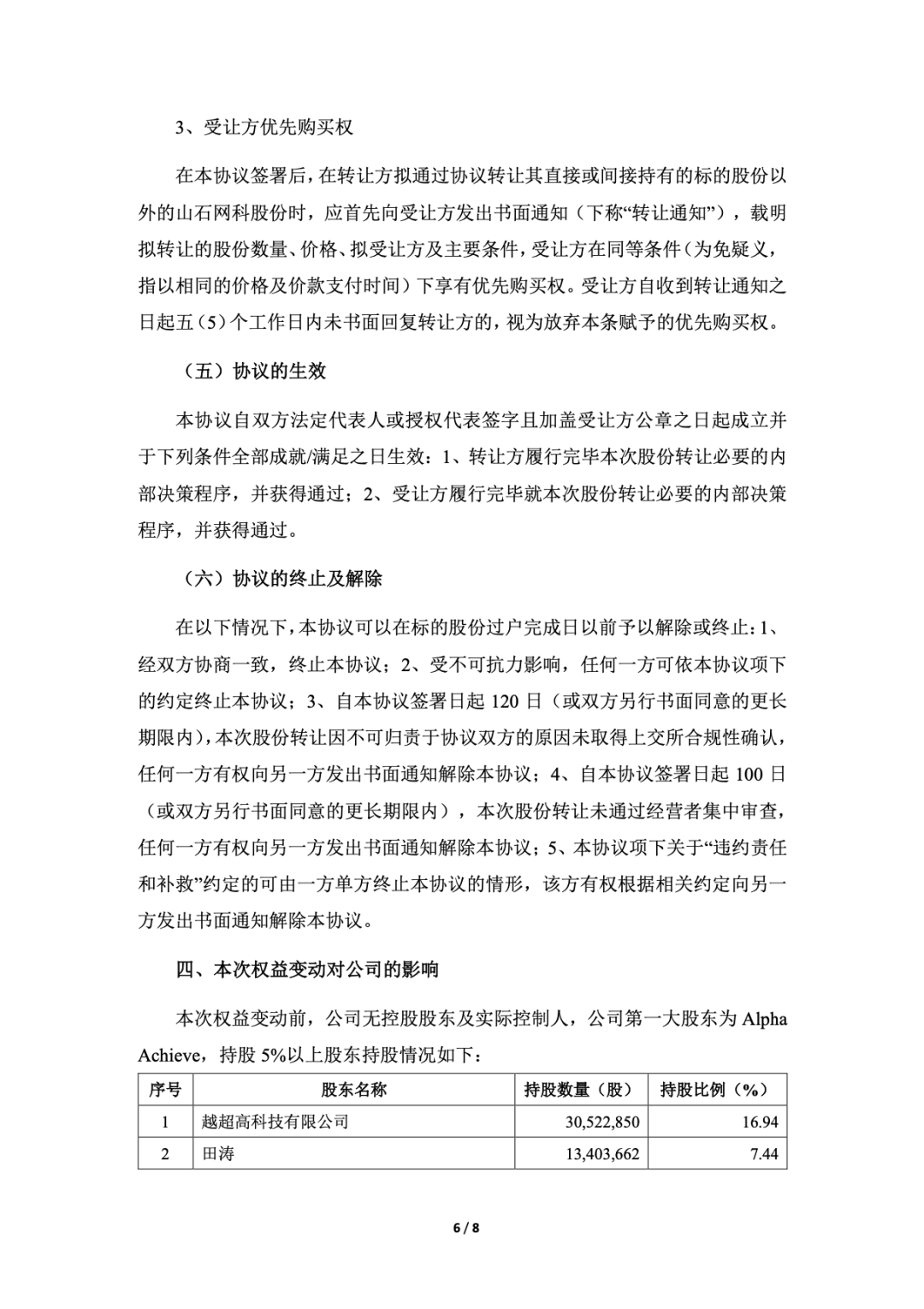 2023 年 2 月 26 日,Alpha Achieve High Tech Limited(越超高科技有限公司)与神州云科签订了《股份转让协议》,拟通过协议转让的方式向神州云科转让其持有的 21,537,000 股山石网科人民币普通股股份,占截至《股份转让协议》签署日山石网科总股本的 11.95%。