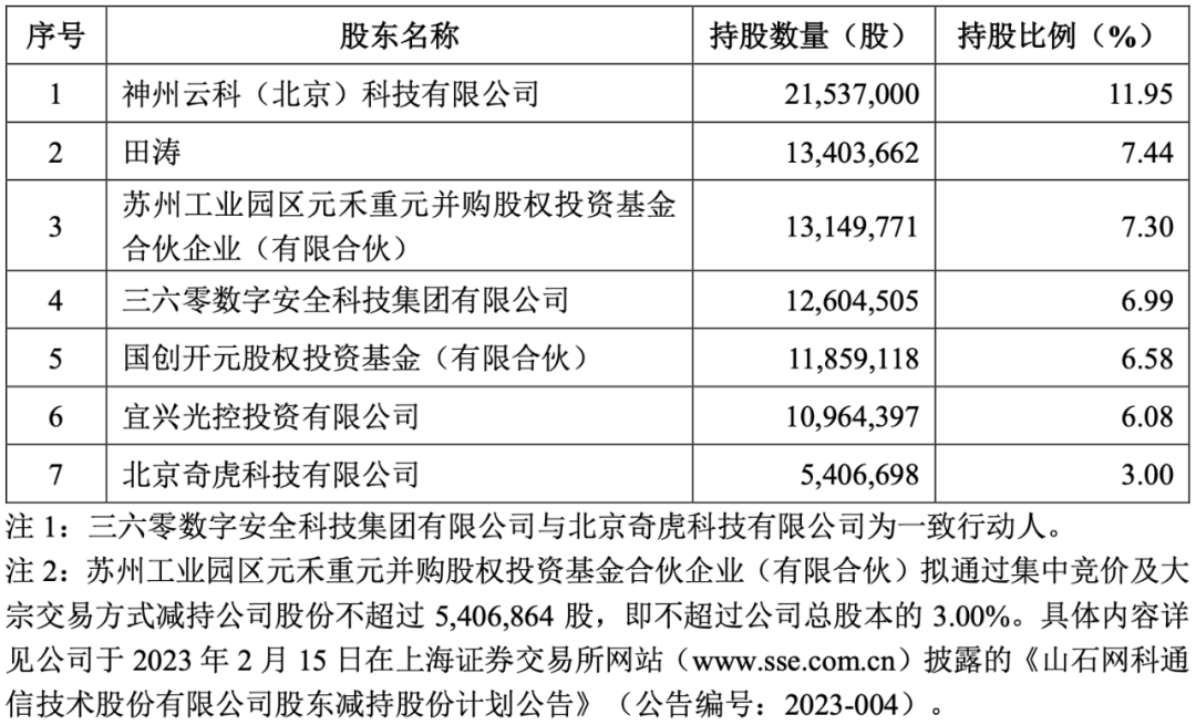 本次权益变动后,山石网科仍无控股股东及实际控制人,第一大股东变更为神州云科,在不考虑可转债转股等其他因素导致股本数量变动的情况下,持股 5%以上股东持股情况如下: