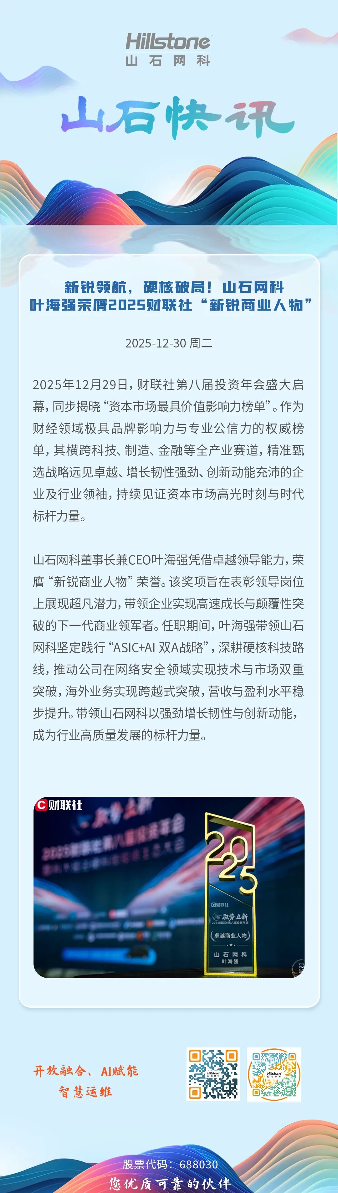 新锐领航,硬核破局!山石网科叶海强荣膺2025财联社“新锐商业人物”