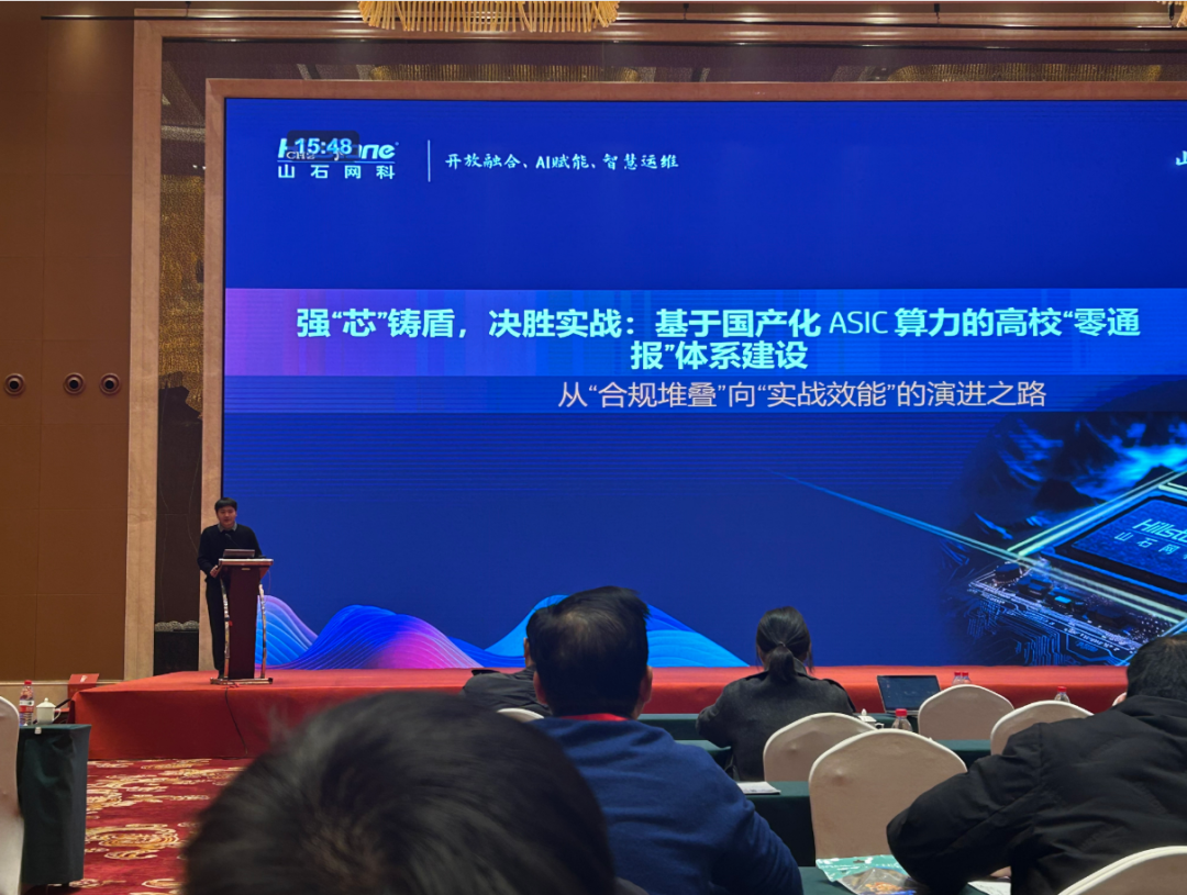 2026年1月15-17日,由安徽省教育和科研计算机网主办的“安徽省教育和科研计算机网2025年学术年会”在安徽省蚌埠市隆重召开。本次大会汇聚了全省各高校信息化办主任、网络中心主任及行业专家学者,旨在深入探讨教育数字化转型下的网络安全新挑战与新路径。山石网科作为网络安全行业的领军企业受邀出席,并发表了《强“芯”铸盾,决胜实战》主题演讲,为高校构建“零通报”实战化防御体系提供硬核方案。