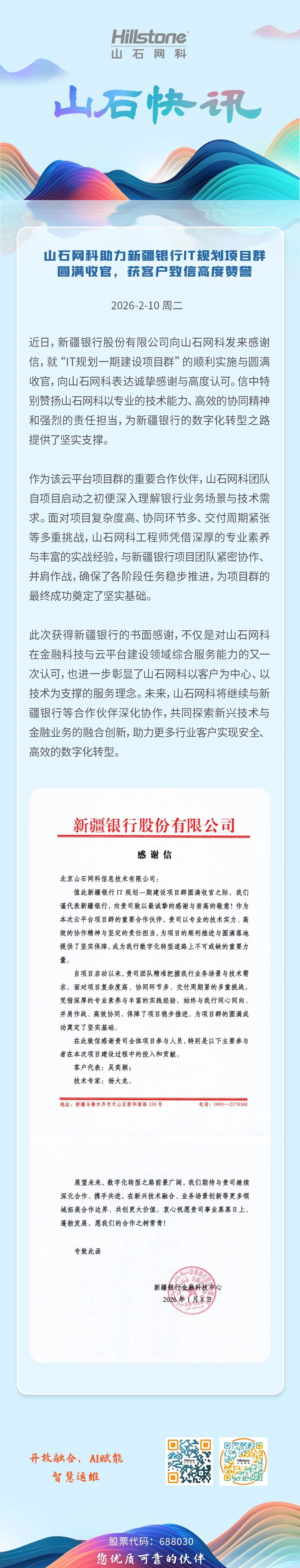 山石网科助力新疆银行IT规划项目群圆满收官,获客户致信高度赞誉