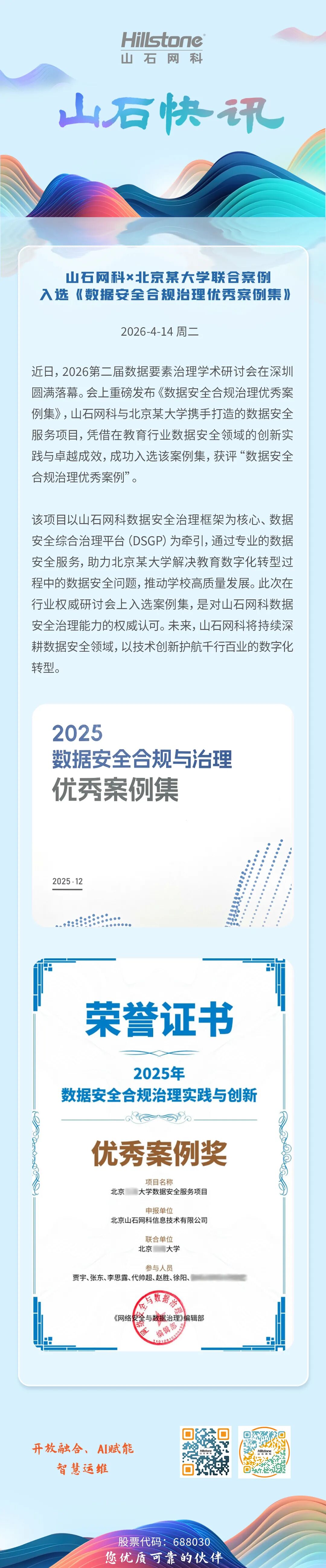 荣耀认证丨山石网科×北京某大学联合案例,入选《数据安全合规治理优秀案例集》