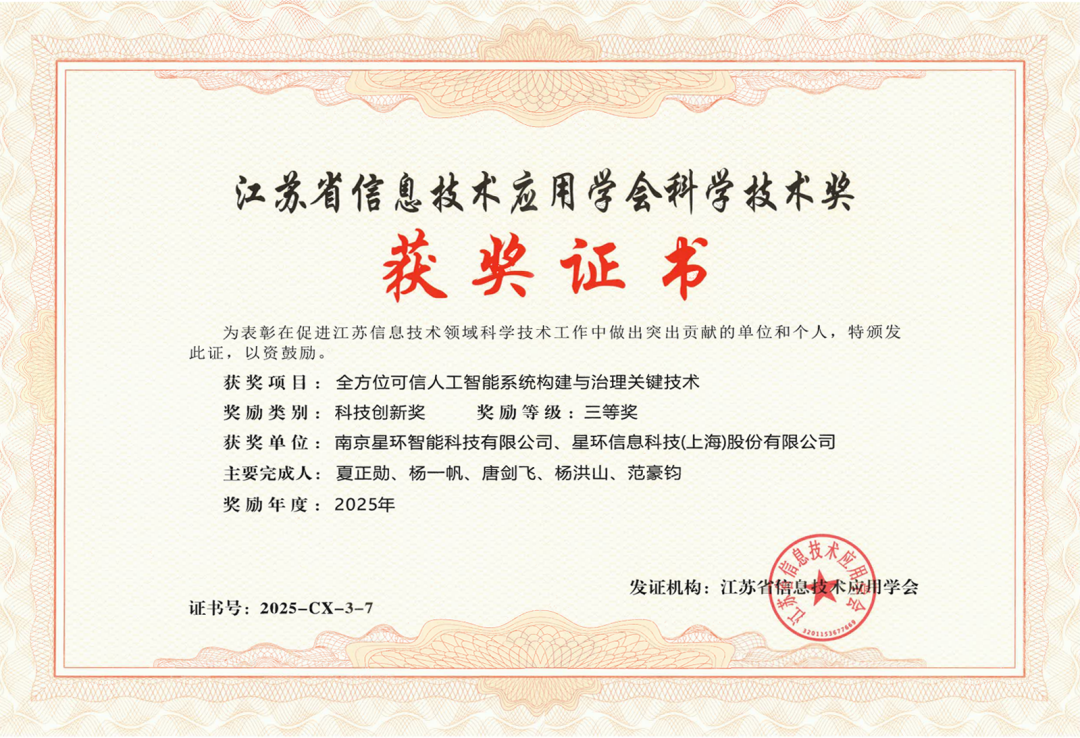 近日, 江苏省信息技术应用学会 正式公布了2025年度科学技术奖获奖名单。 星环科技 申报的“全方位可信人工智能系统构建与治理关键技术”项目,凭借其突出的技术创新性与应用价值,荣获“科技创新奖”三等奖。这一荣誉标志着 星环科技 在可信人工智能这一前沿核心领域的研发实力与技术成果获得了省级行业权威机构的高度认可。