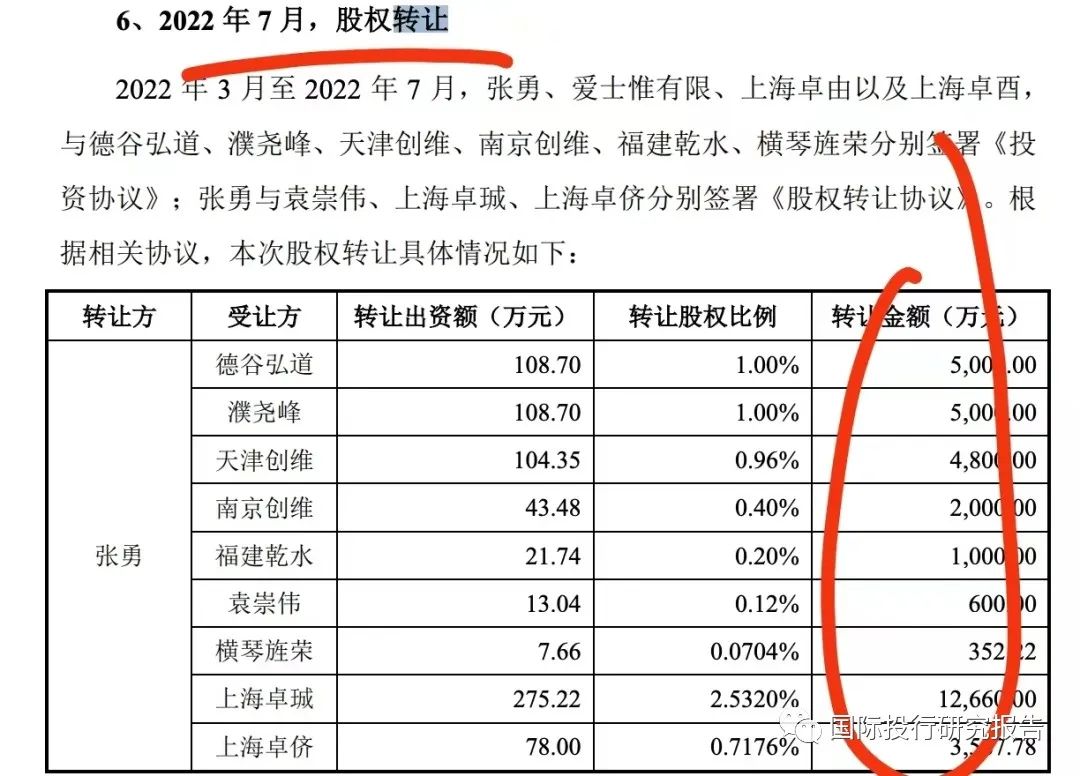 3、现在笑出声音应该是控制人张勇老师了。此张勇不是阿里巴巴的张勇,那个张勇肯定也在笑。IPO说明书显示,借光伏逆变器的东风,张勇在2022年成功把股票转让给南存辉等私募基金和公司,套现3.922亿。虽然IPO不成功,但即使IPO成功控制人也要三年后套现,张勇老师的这个流程顶呱呱!