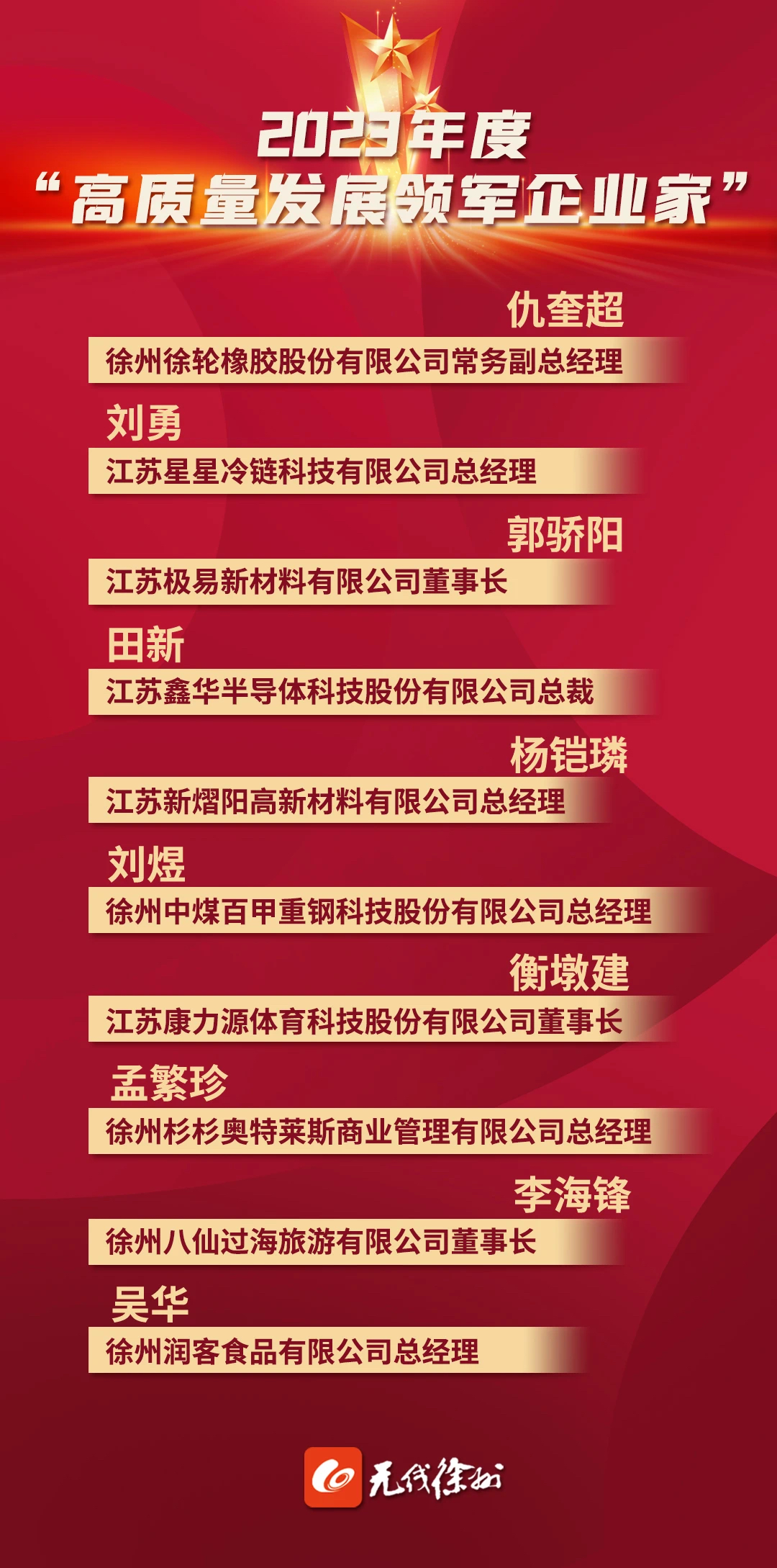 近日,“奋进的力量”——2023年度徐州经济风云人物颁奖活动隆重举行。徐州市委书记宋乐伟致辞,市委副书记、市长王剑锋,市人大常委会主任王安顺,市政协主席王强,市委副书记、政法委书记韩冬梅等出席活动并向受表彰的企业和企业家颁奖。