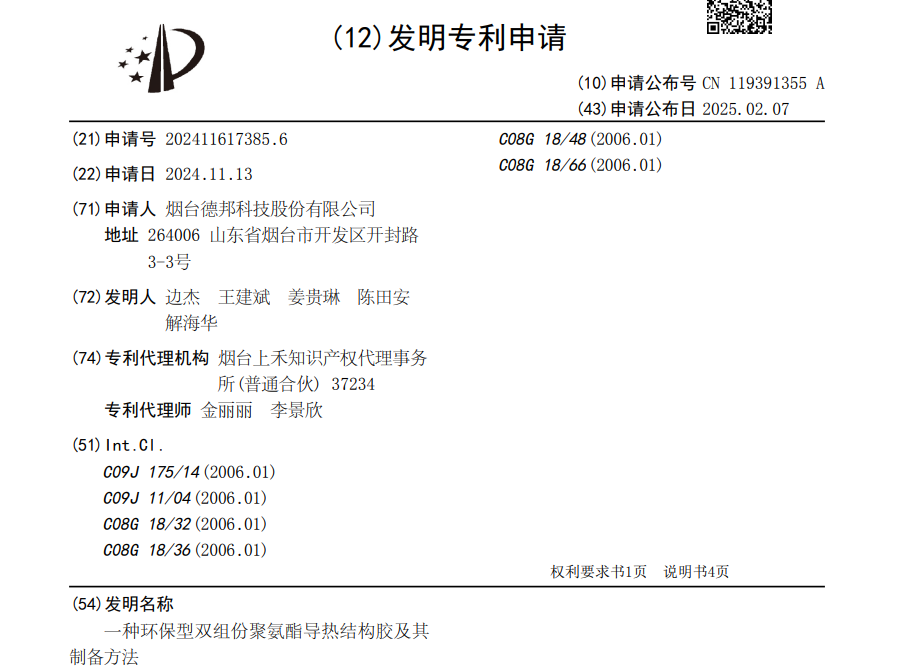 环球聚氨酯网讯:近日,烟台德邦科技股份有限公司成功申请了一项名为“一种环保型双组份聚氨酯导热结构胶及其制备方法”的发明专利,专利号为CN202411617385.6。该专利于2025年2月7日正式公开,标志着公司在环保材料领域的技术创新迈出了重要一步。