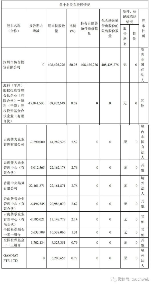 云南传力企业管理有限公司持股为5.52%,云南传力企业管理中心(有限合伙)持股为2.76%,香港中央结算有限公司持股为2.76%,云南传音企业管理中心(有限合伙)持股为2.62%;