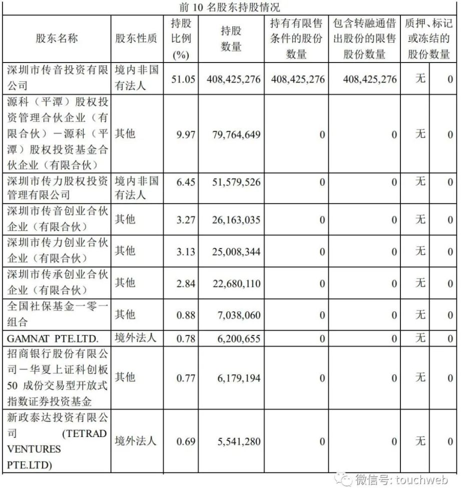 截至2021年6月30日,深圳市传音投资有限公司持股为51.05%,源科(平潭)股权投资管理合伙企业(有限合伙)-源科(平潭)股权投资基金合伙企业(有限合伙)持股为9.97%;