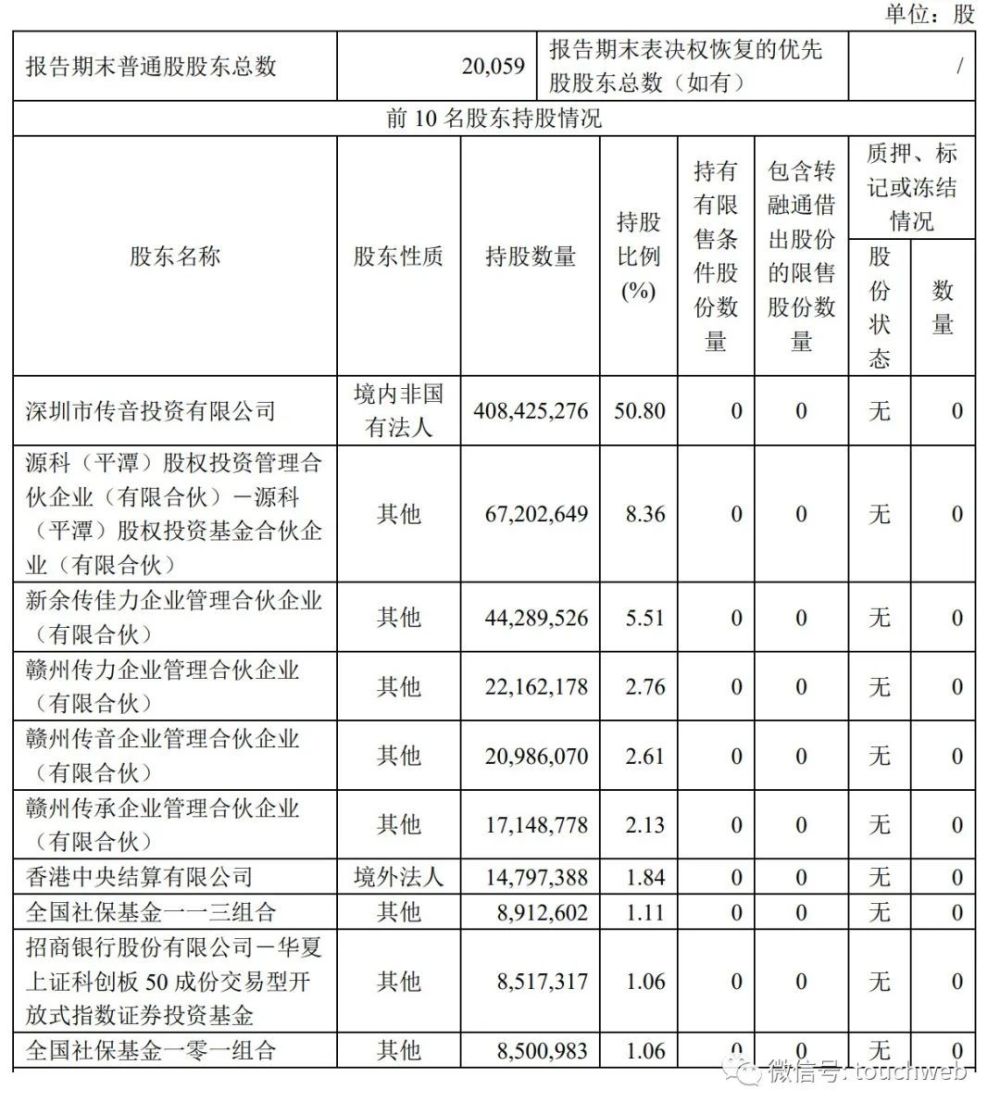 竺兆江持有深圳市传音投资有限公司20.68%股权,间接控制公司。新余传佳力企业管理合伙企业(有限合伙)、赣州传力企业管理合伙企业(有限合伙)、赣州传音企业管理合伙企业(有限合伙)、赣州传承企业管理合伙企业(有限合伙)为员工持股平台。
