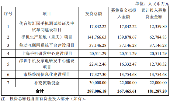 公告显示,2019年,传音控股IPO计划拟募集资金30.11亿元用于手机制造基地、移动互联网系统平台、手机及家电研发中心、市场终端信息化、补充流动资金7个项目的建设。其中深圳手机及家电研发中心建设项目原计划总投资约2.24亿元,其中募集资金拟投入金额约1.63亿元,建设期为3年。