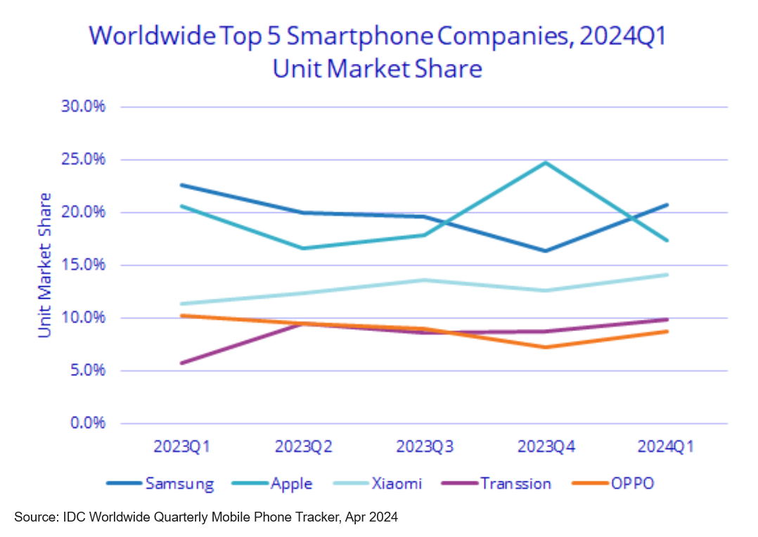 据第三方机构IDC统计,在2023年二季度开始,传音份额开始与OPPO十分接近,第四季度甚至延伸到今年一季度,传音超过OPPO位列全球智能机出货第四位。