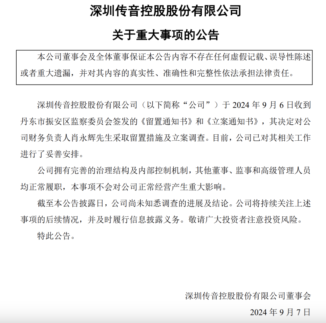 传音控股在提交给上海证券交易所的文件中表示:“截至提交日,公司尚不清楚调查的进展或结论。”公司董事会在文件中表示,公司拥有完善的治理和内部控制结构,该事件不会对运营产生重大影响。