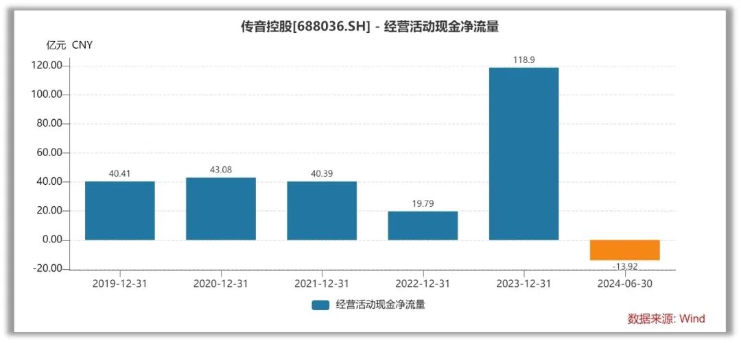 截至上半年经营活动产生的现金流量净额为-13.92亿元,上年同期为69.59亿元。8月28日,传音控股有关负责人在业绩说明会上表示,半年度经营活动产生的现金流量净额为负主要是销售款和采购款的收支存在一定时间的错位,公司销售端是预收款为主,销售端通常季节之间存在一定的波动,去年第四季度销售额约193亿元,今年第二季度约171亿元,相差20亿元左右。采购端有一定账期,2024年上半年到期的采购款较大,付款同比增长较多。二级市场上,近四个月以来,传音控股的股价下跌了约35%。