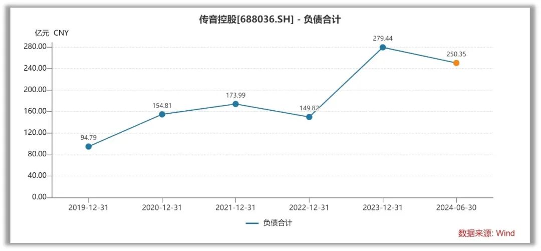 根据2024年半年报数据显示,传音控股负债合计250.35亿元。