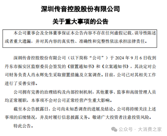 日前,全球第二大手机公司,被誉为非洲手机之王的传音控股发布公告,公司于2024年9月6日收到丹东市振安区监察委员会签发的《留置通知书》和《立案通知书》,其决定对公司财务负责人肖永辉采取留置措施及立案调查。据统计,今年以来已经有30多家上市公司高管被监察机关留置,其中20多人次同时被立案调查。