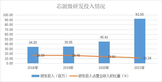 研发创新方面,芯源微在持续加大研发投入,近四年累计研发投入接近2.07亿元,2021年将近1亿元,比上一年增长103.68%。不过从研发力度上看略有下滑,研发投入虽然有所增加,但占营业收入比重仍在降低,2021年仅为11.16%。