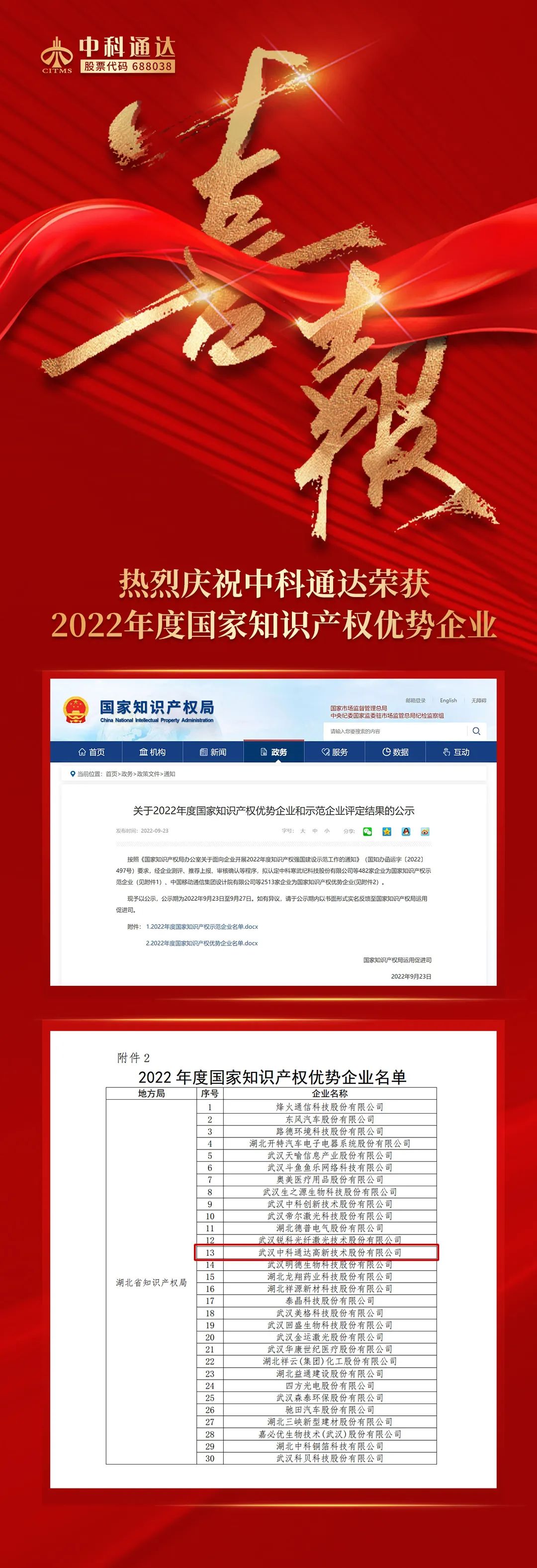【企业快讯】热烈庆祝中科通达荣获2022年度国家知识产权优势企业