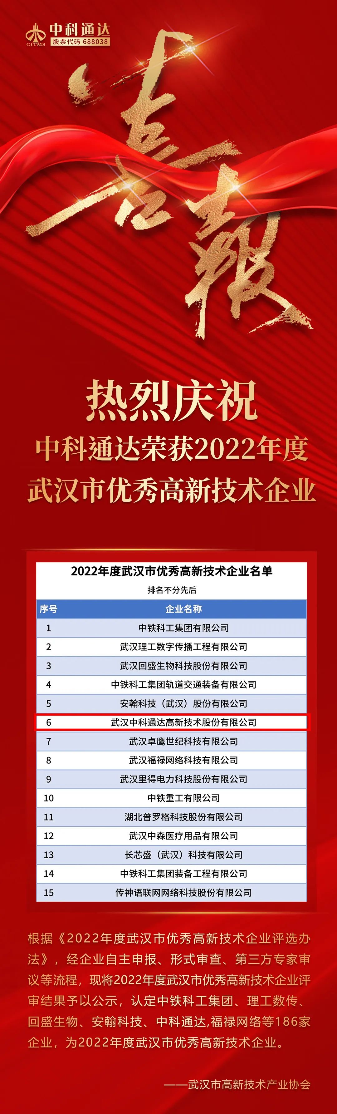 【企业快讯】热烈庆祝中科通达荣获2022年度武汉市优秀高新技术企业
