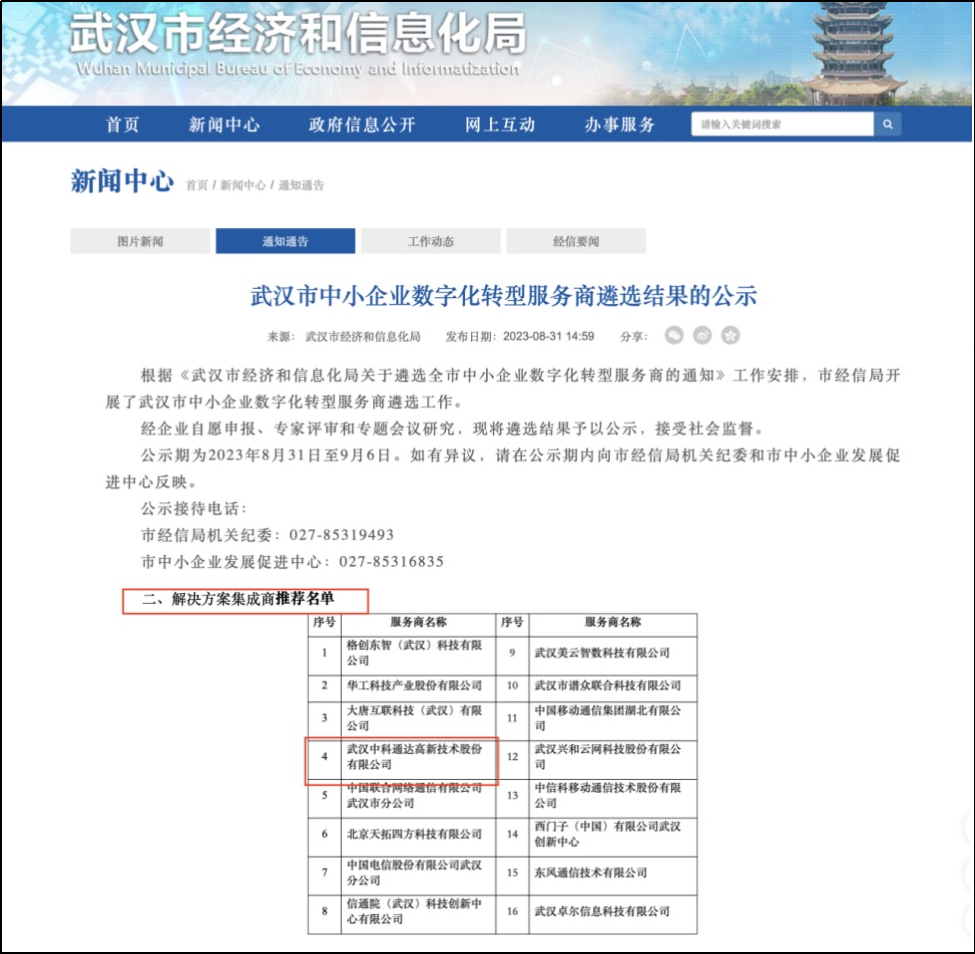 2023年8月31日,武汉市经济和信息化局公示《武汉市中小企业数字化转型服务商遴选结果》,中科通达成功入选“武汉市中小企业数字化转型服务商-解决方案集成商”推荐名单!
