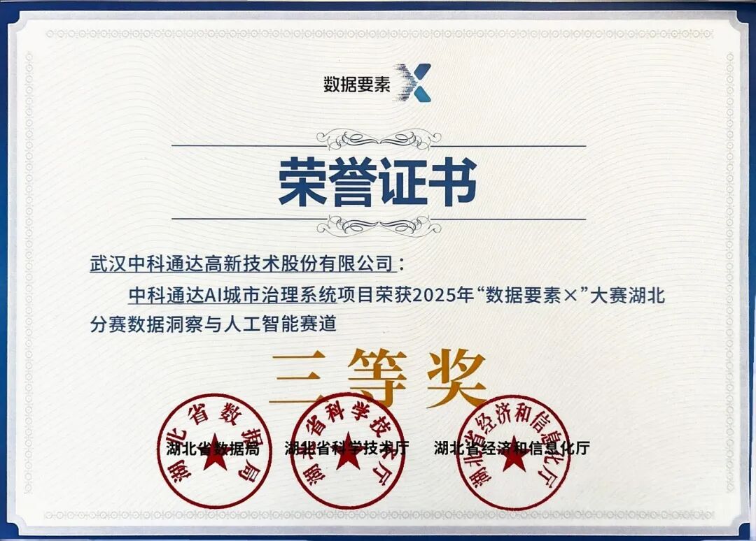 中科通达AI城市治理系统获“数据要素×”大赛湖北分赛“数据洞察与人工智能”赛道三等奖,后被纳入湖北省2025年“数据要素×”典型案例集,省级权威背书进一步夯实。