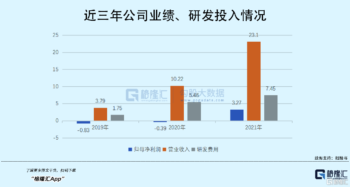 业绩方面,2019年-2021年公司营收分别为3.79亿元、10.22亿元和23.1亿元,对应的归母净利润分别为-0.83亿元、-0.39亿元和3.27亿元;公司研发资金投入逐年加大,近三年累计投入14.66亿元。