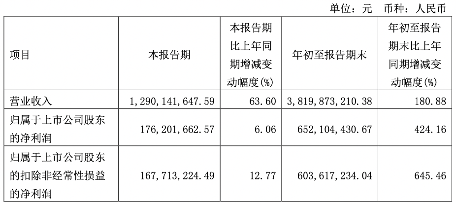 第三季度营收 12.9 亿,同比增长 63.6%;净利润 1.76 亿,同比增长 6.06%。研发投入 4.93 亿。