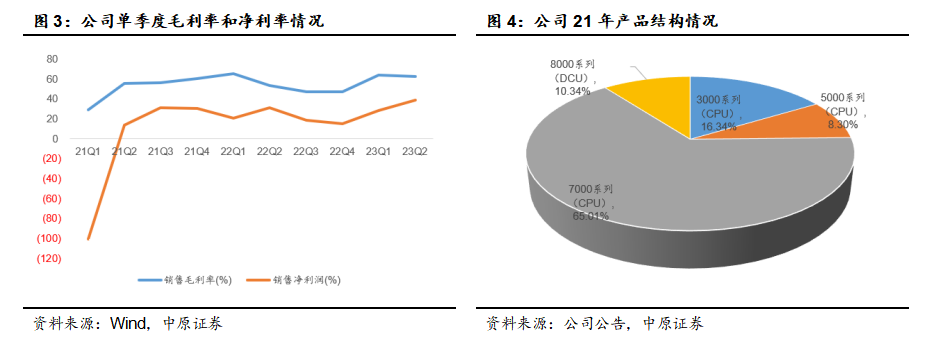 海光为国内CPU+GPGPU高端处理器领先企业,在产品性能、安全、生态方面具有较强的竞争优势,并拥有行业内优质客户。公司是少数几家同时具备高端通用处理器(CPU)和协处理器(DCU)研发能力的企业,海光DCU属于GPGPU的一种。公司的CPU和DCU产品性能优异,在国内处于领先地位,并不断提升高端处理器性能。公司高度重视处理器的安全性,通过扩充安全算法指令集及原生支持可信计算等方法,有效地提升了海光高端处理器的安全性。海光CPU兼容x86 指令集,处理器性能参数优异,支持国内外主流操作系统、数据库、虚拟化平台或云计算平台,能够有效兼容目前存在的数百万款基于x86指令集的系统软件和应用软件,具有优异的生态系统优势;海光DCU兼容“类 CUDA”环境,软硬件生态丰富。公司拥有浪潮、联想、新华三、同方等国内知名服务器厂商客户,公司高端处理器产品广泛应用于多款服务器,并已经得到了国内行业用户的高度认可。