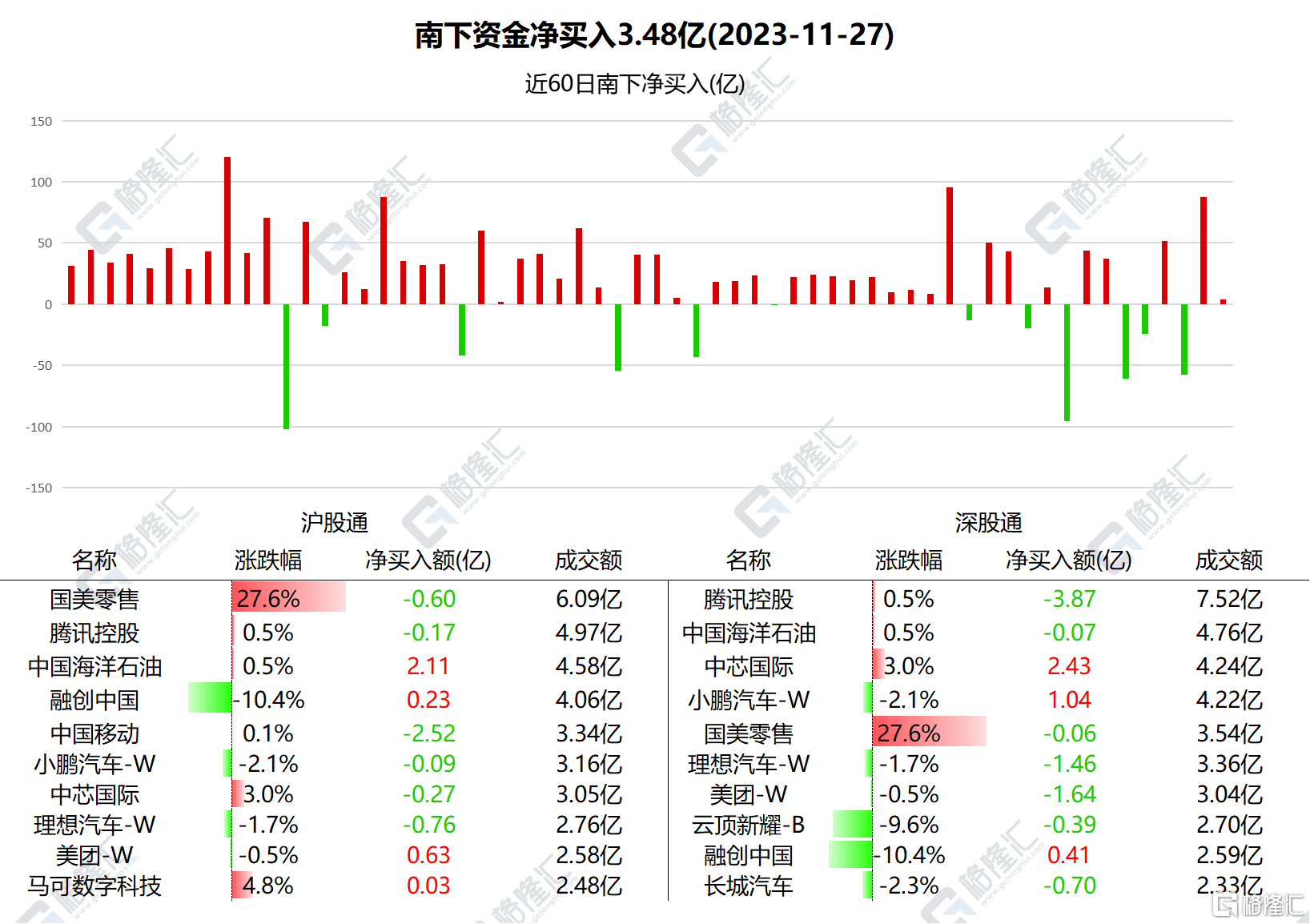 南下资金净买入港股3.48亿港元。其中,港股通(沪)净买入3.5亿港元,港股通(深)净卖出0.02亿港元。