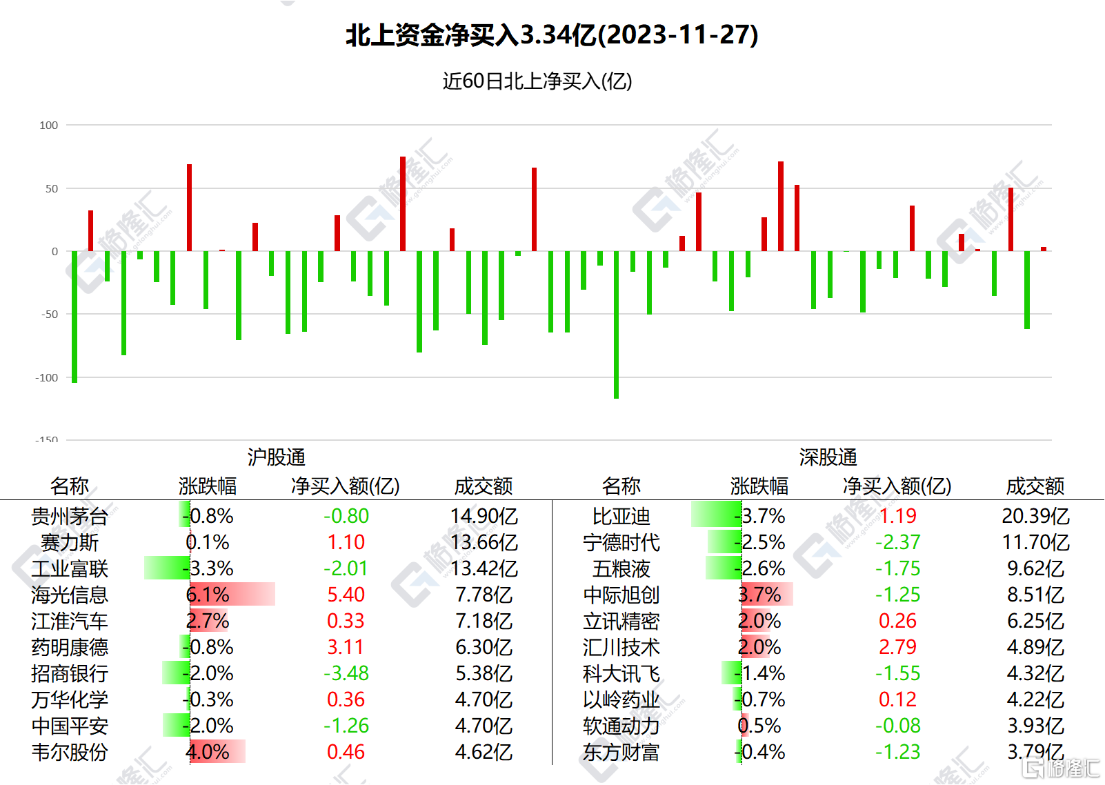 11月27日,北上资金净买入A股3.34亿元,沪股通净买入12.43亿元,深股通净卖出9.09亿元。